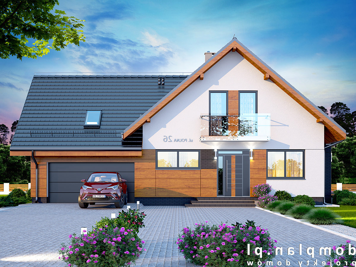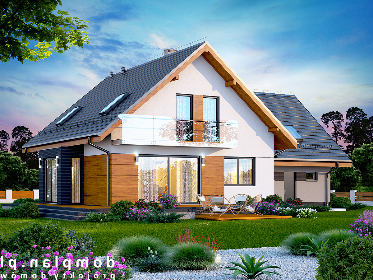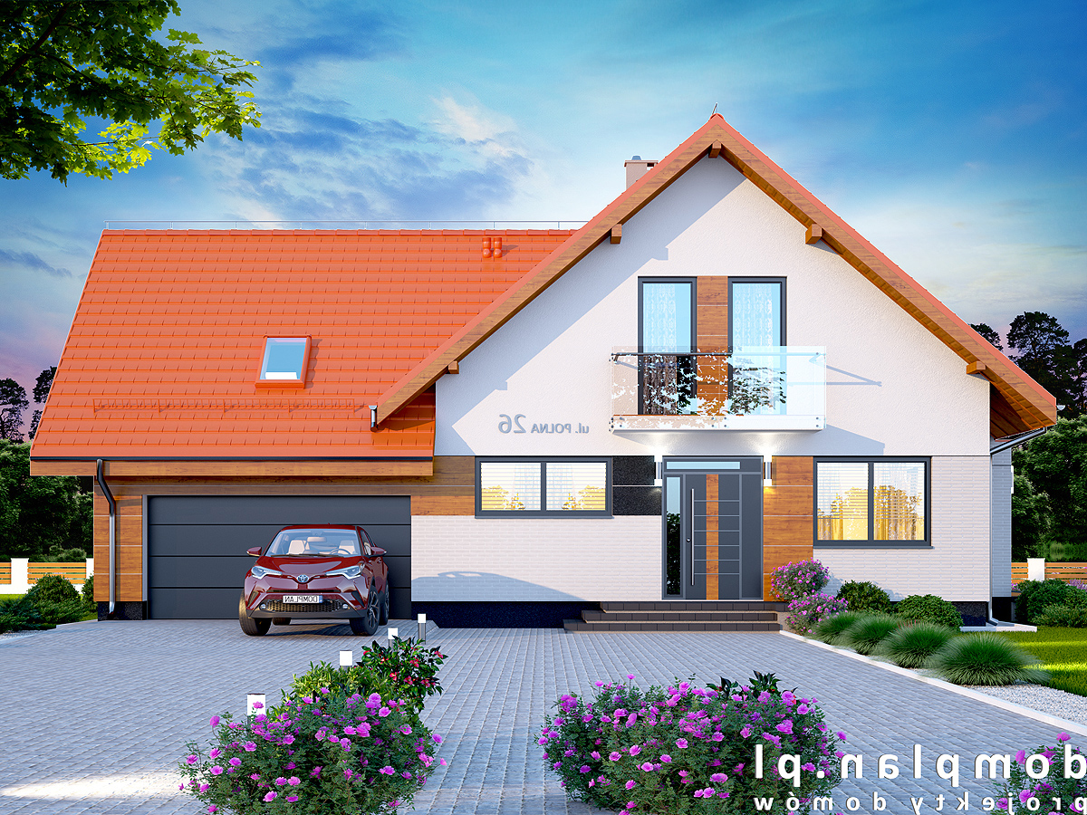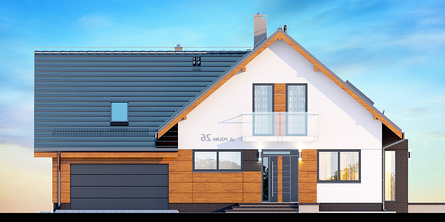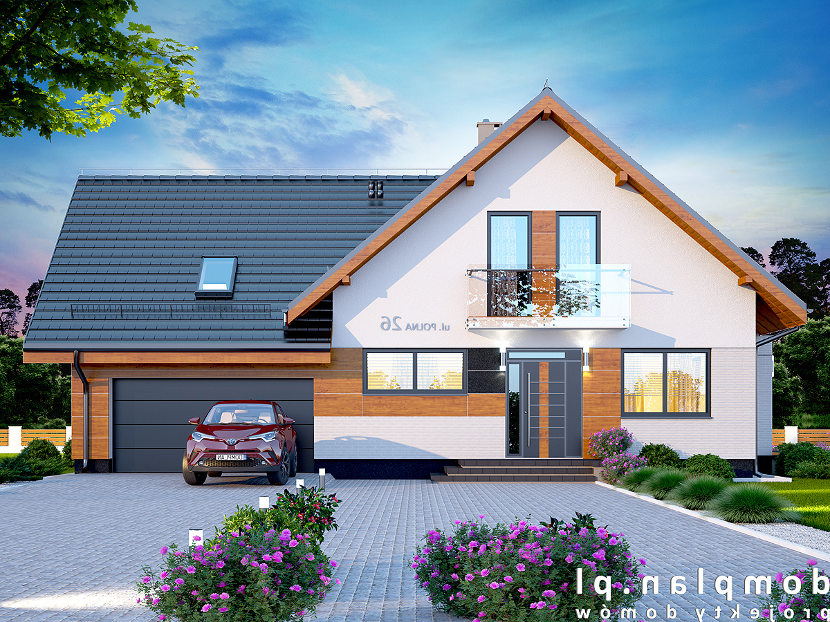 ALION 2M Z WYKUSZEM to bardzo funkcjonalny i atrakcyjny wizualnie dom dla 3-6 osobowej rodziny o eleganckiej formie i współczesnej estetyce oraz prostej, taniej, dokładnie przemyślanej konstrukcji. Jest to budynek parterowy z użytkowym poddaszem, niepodpiwniczony, z garażem dwustanowiskowym. Bryła domu jest tradycyjna, zaprojektowana z najwyższą dbałością o proporcje i funkcjonalność. Na parterze budynku zaprojektowana została przestronna i wygodna strefa dzienna składająca się z kuchni, jadalni ze słonecznym wykuszem oraz salonu otwartego na taras i ogród. Kuchnia w zależności od potrzeb może być zamykana, np. drzwiami przesuwnymi lub otwarta, stanowiąc jedną strefę wraz z jadalnią i salonem. Dzięki doświetleniu strefy dziennej zarówno od strony ogrodu jak i z boku- od strony jadalni, dom nadaje się na każdą działkę, zarówno z wjazdem od północy jak i od południa, wschodu bądź zachodu. Uzupełnieniem kuchni jest pojemna spiżarka. Na parterze zaprojektowano również pokój, który może służyć jako pokój gościnny, gabinet czy pokój najstarszego członka rodziny, łazienkę, garderobę, która może też pełnić funkcję pomieszczenia gospodarczego oraz garaż i kotłownię dostępną z garażu z wyjściem na ogród dzięki czemu może ona stanowić też miejsce składowania narzędzi ogrodowych. W wiatrołapie przewidziano miejsce na pojemną szafę wnękową. Na poddaszu znalazły się trzy wygodne pokoje oraz funkcjonalna łazienka z wanną i kabiną prysznicową oraz pralką. Strych dostępny jest z półpiętra, może on być przeznaczony na dodatkowy pokój, garderobę, pralnię, siłownię, saunę czy salę z kinem domowym. Może się w nim znaleźć np. sala do gry w bilard z barkiem. Strych może zostać też podzielony na kilka pomieszczeń o różnych funkcjach. W projektowaniu budynku ALION 2M Z WYKUSZEM szczególną uwagę zwrócono na atrakcyjny, nowoczesny wygląd zewnętrzny, proporcjonalność bryły budynku, odpowiednie doświetlenie i funkcjonalne rozplanowanie pomieszczeń przy zachowaniu prostoty konstrukcji oraz zwartości bryły domu. Dom zaprojektowano jako energooszczędny. Dostępne są również inne wersje projektu: ALION - z garażem jednostanowiskowym, ALION 2M, ALION MAŁY, ALION MAŁY 2M.