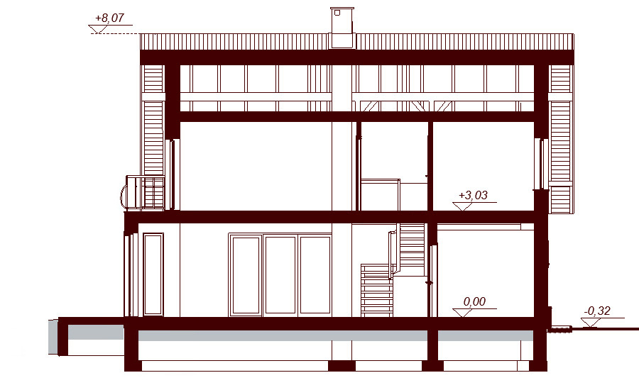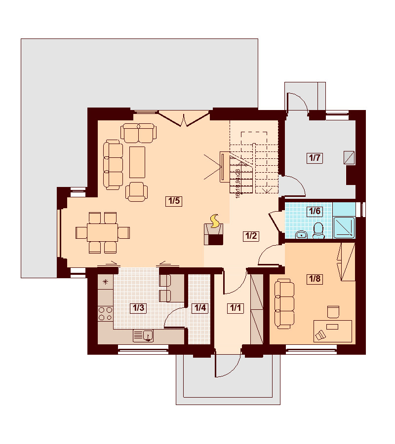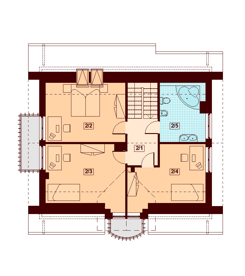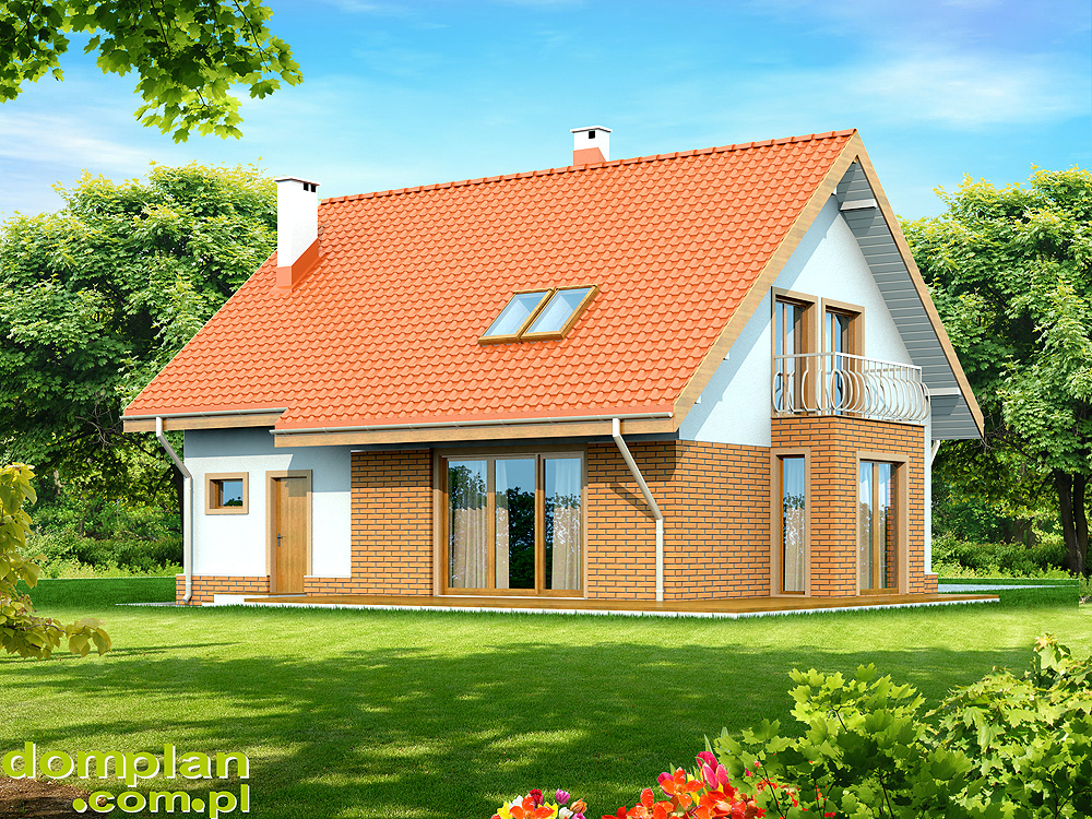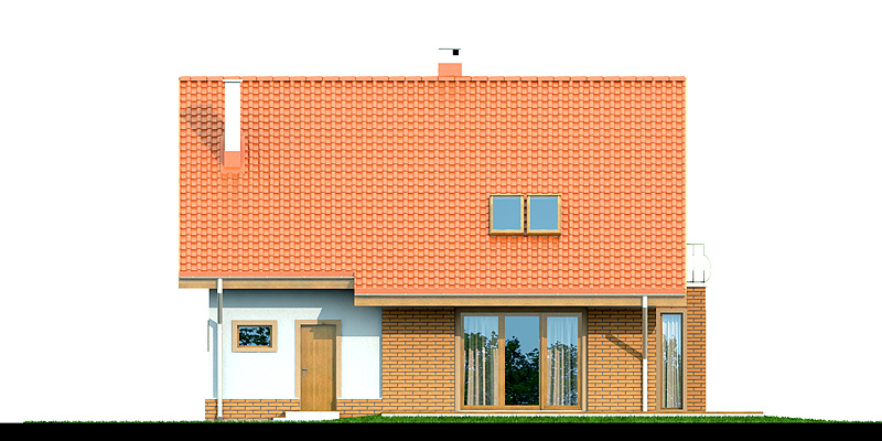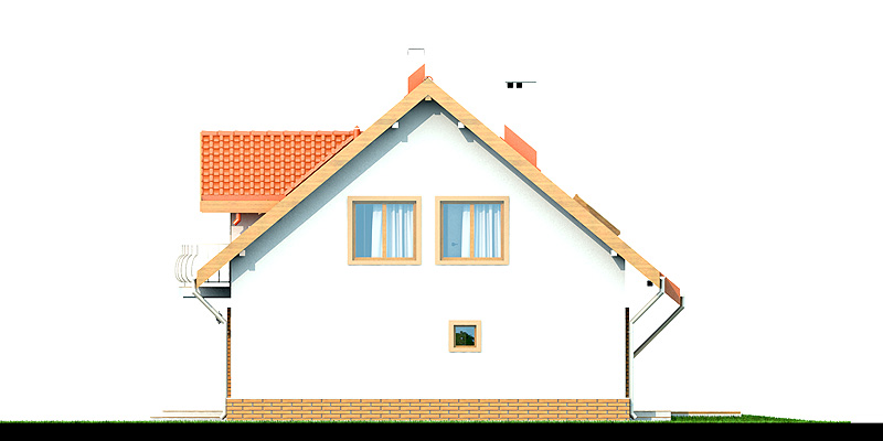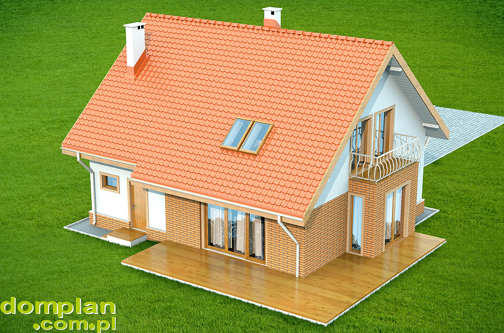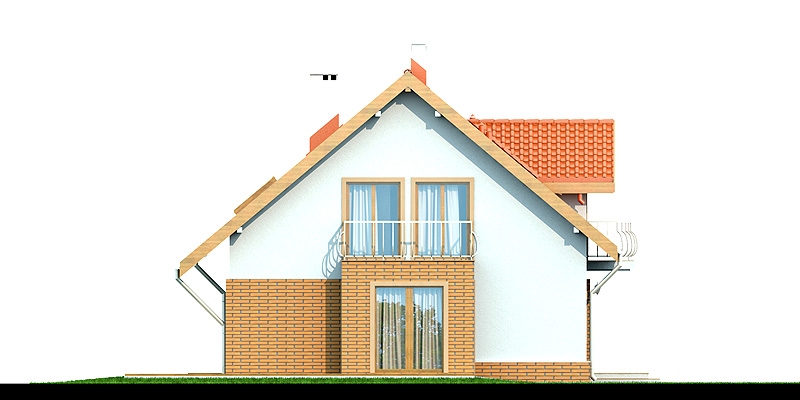 Belinda to piękny, funkcjonalny dom o prostej i taniej, dokładnie przemyślanej konstrukcji, przeznaczony dla 3-6 osobowej rodziny, o eleganckiej formie i tradycyjnej estetyce. Jest to budynek parterowy z użytkowym poddaszem, niepodpiwniczony. Na parterze zlokalizowana jest obszerna strefa dzienna składająca się z kuchni (która w zależności od potrzeb może być zamykana lub otwarta) jadalni ze słonecznym wykuszem oraz salonu otwartego na taras i ogród. Uzupełnieniem kuchni jest pojemna spiżarnia. Schody w holu w zależności od potrzeb mogą być otwarte na salon powiększając w ten sposób przestrzeń dzienną i stanowiąc ciekawy element architektoniczny, mogą też być odizolowane ścianką działową od salonu. Dzięki doświetleniu strefy dziennej zarówno od strony ogrodu jak i z boku dom nadaje się na każdą działkę, zarówno z wjazdem od północy jak i od południa, wschodu bądź zachodu. Dodatkowo na parterze zaprojektowano pokój który może służyć jako pokój gościnny bądź gabinet, łazienkę oraz pomieszczenie gospodarcze. W wiatrołapie przewidziano miejsce na dużą szafę wnękową. Na poddaszu znalazły się trzy pokoje oraz wygodna łazienka. Architektura domu to połączenie tradycji z nowoczesnością oraz elegancji z dbałością o proporcje i estetykę. Dom zaprojektowano jako energooszczędny. Dostępna również wersja projektu bez wykusza w jadalni, nadająca się na mniejszą działkę (projekt Armanda).